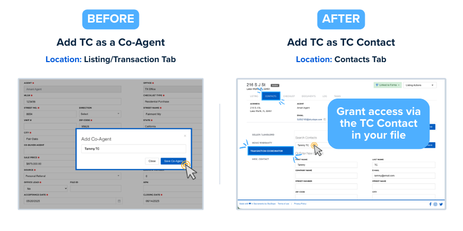 The process for granting your TC full access to your SkySlope Listing or Transaction file has recently changed. Instead of adding them as a Co-Agent on the Listing or Transaction tab, you will now add them as the Transaction Coordinator contact in the Contacts tab.