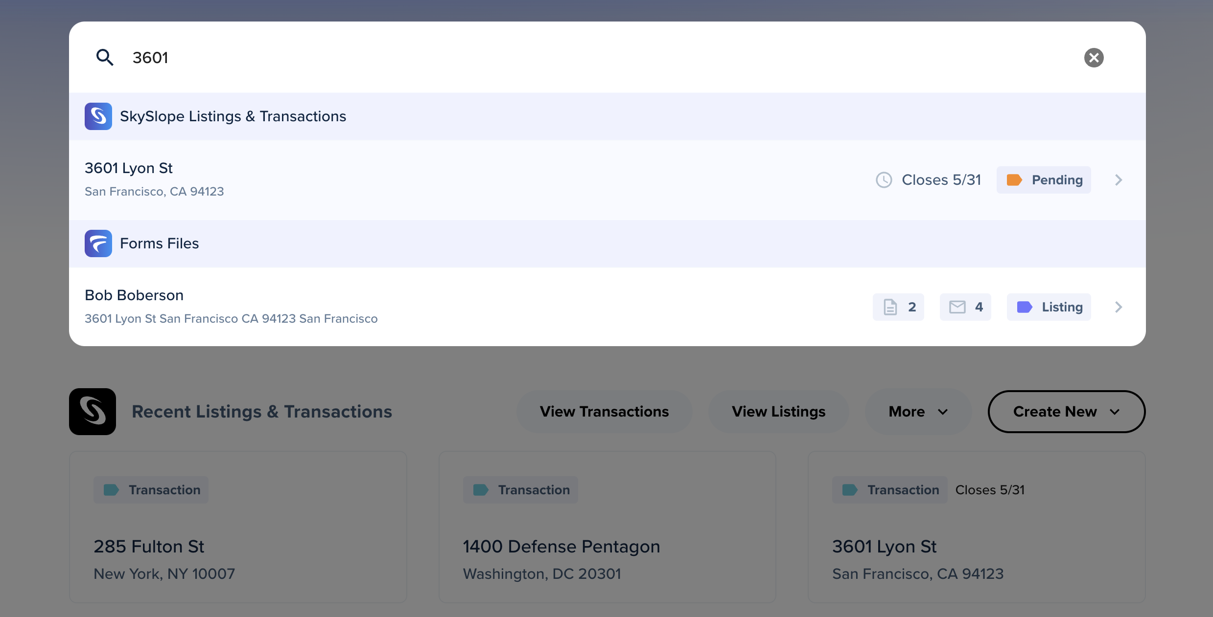 1. First, open the SkySlope file. Click on View Listings or View Transactions or use the Search Bar on the homepage to locate the address, and then single-click open the file.