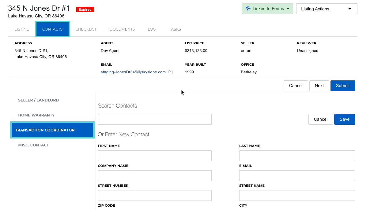 - Once on the Contacts tab, click on the Transaction Coordinator contact.