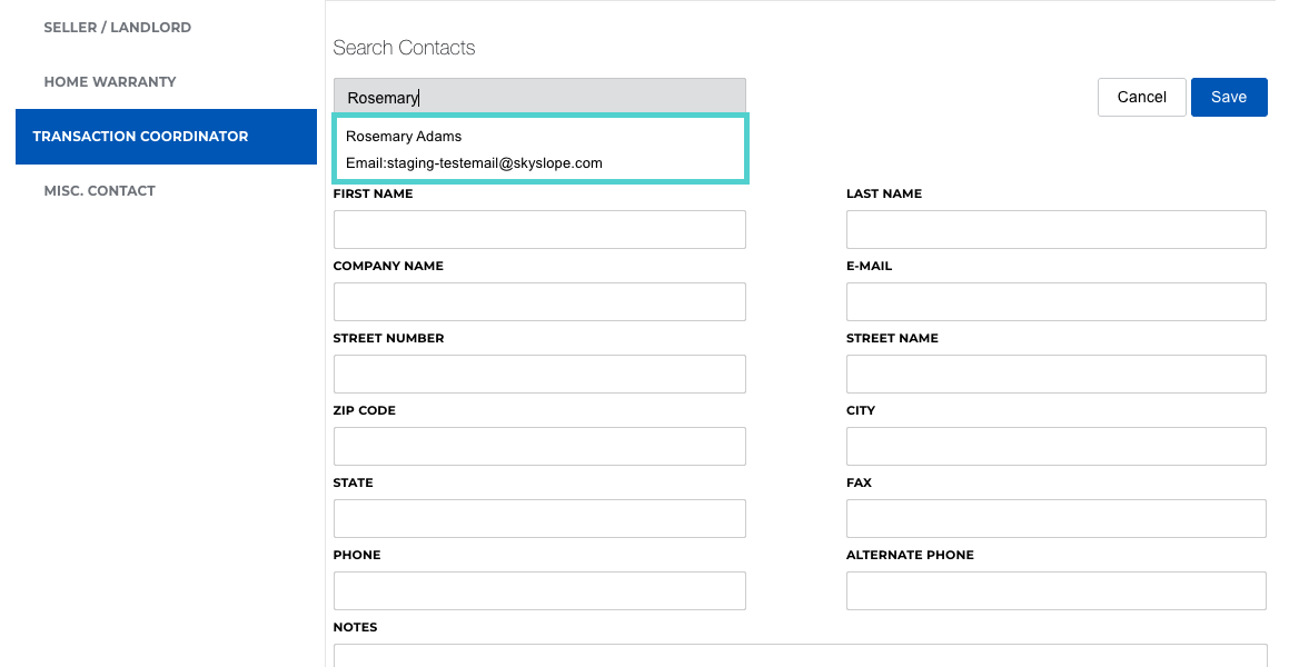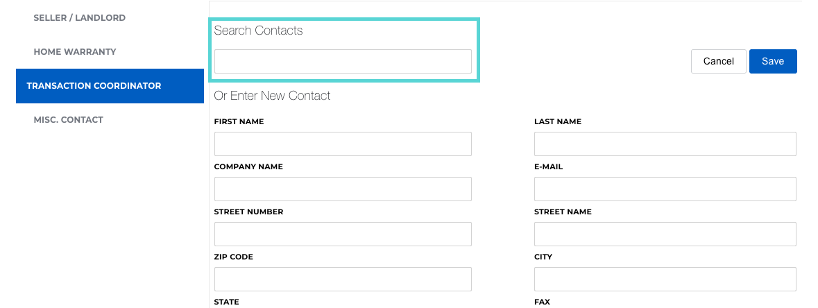 It's essential that you use the Search Contacts tool to locate an existing contact from your brokerage's directory. This is the only way to grant them access to the file. If you simply type their name in the First Name and Last Name fields, you are only listing their name as a TC; you will not grant them access this way.