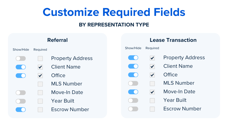 The information that must be collected can vary depending on the file’s representation type (e.g., Buyer Rep or Seller Rep). For example, the information required when a Buyer’s Agent closes a deal may differ from what’s needed for a Listing Agent. To accommodate this, brokerages can now customize which fields are required or optional for each representation type.